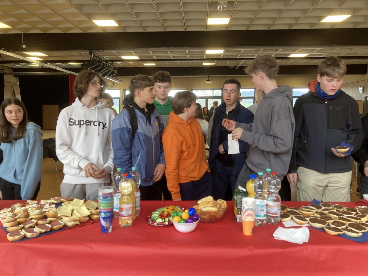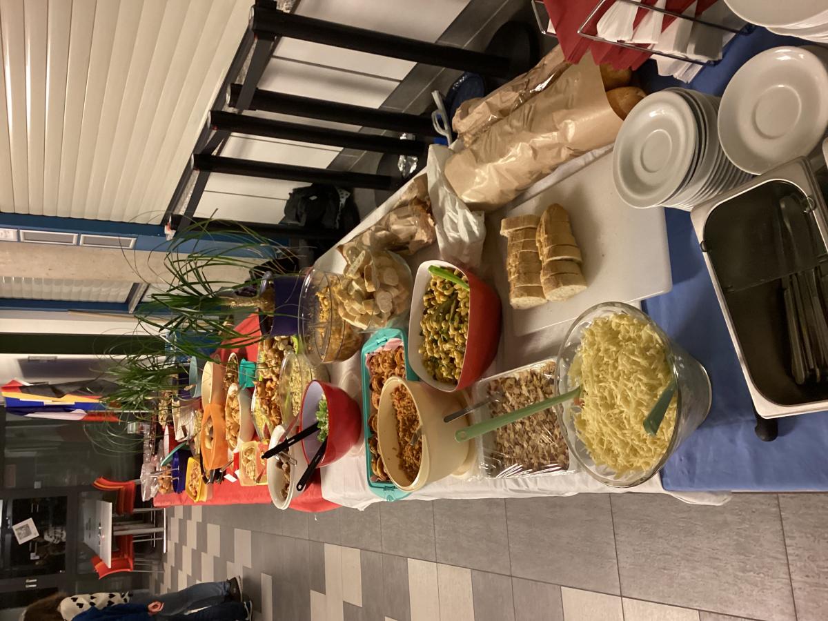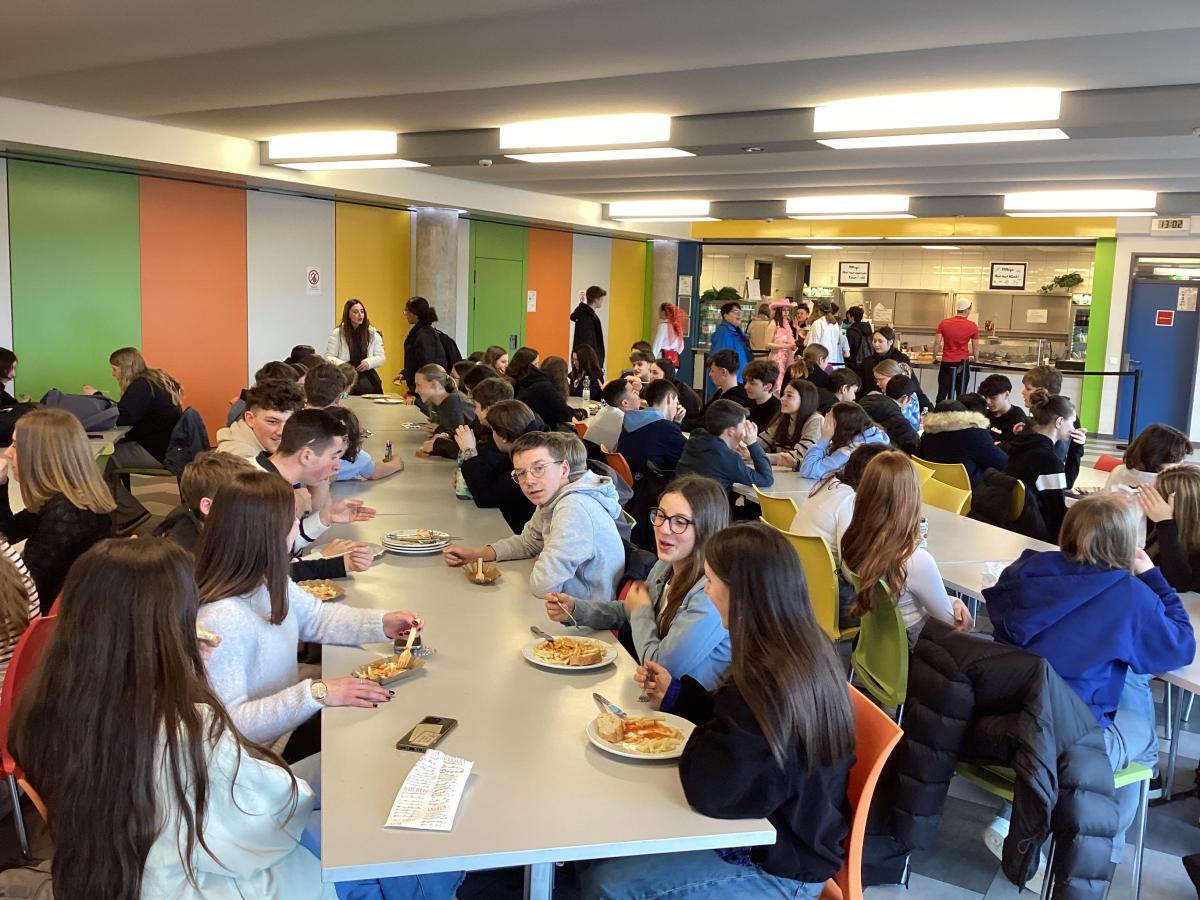 19h. Parents et jeunes se sont retrouvés au self. Présentation des projets, discours et remerciements, un buffet gargantuesque préparé par les familles. Un grand moment fut la participation de tous à un Kahoot sur les jeux olympiques : 20 questions rédigées en bilangue, puis la remise des prix de l'olympiade de la veille ! Après le repas, nous avons dû rejoindre notre bus, non sans peine, la séparation fut difficile pour un grand nombre ! Nos élèves ont hâte de revoir leurs nouveaux amis l'an prochain et ont exprimé leur envie forte de progresser en allemand.