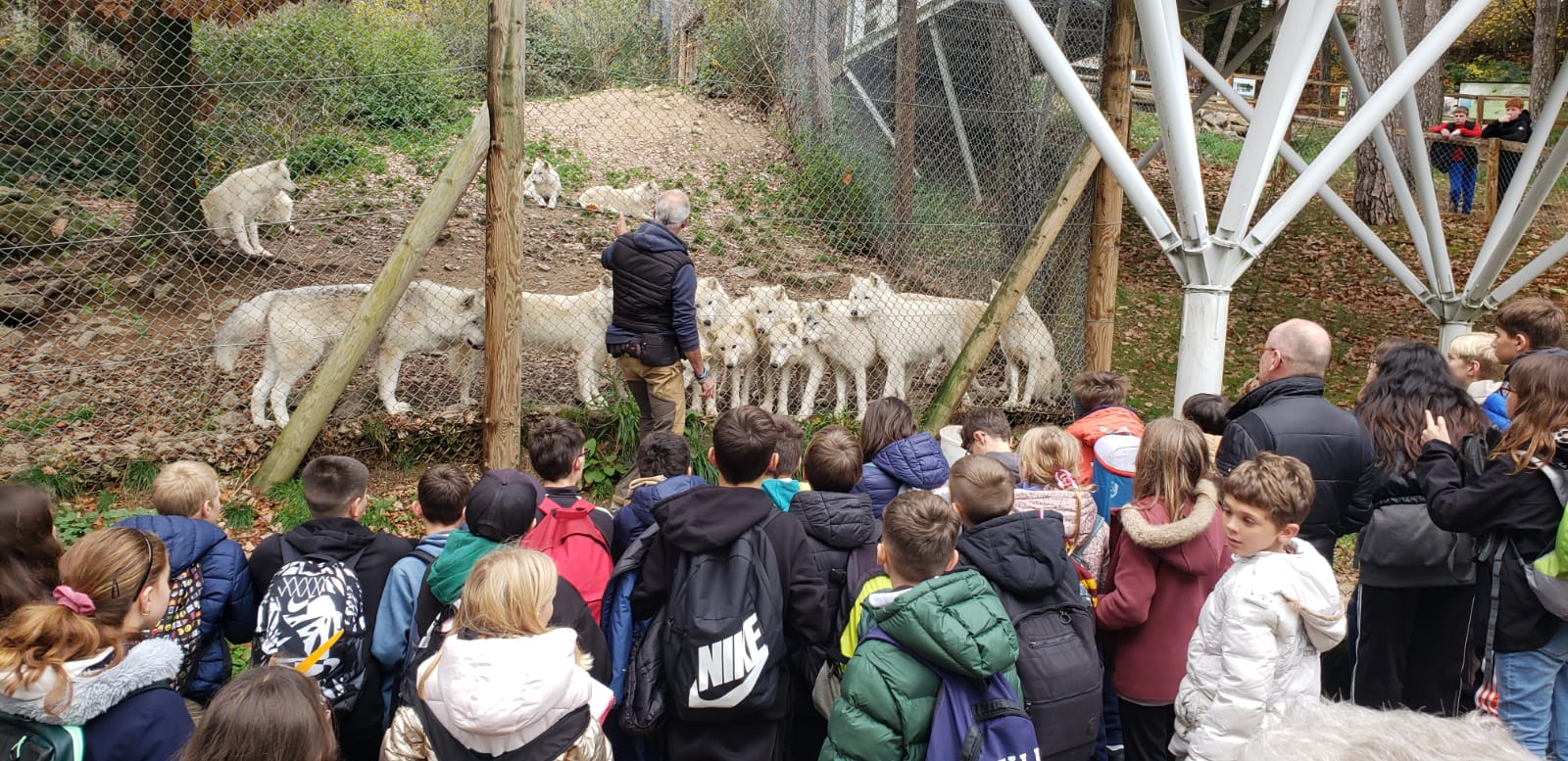Il était temps de remonter dans les cars en direction de Saint-Léger-de-Peyre, près de Marvejols, en Lozère, pour découvrir la réalité du loup sous toutes ses formes : guidés par un soigneur, nous avons pu admirer, autant attendris qu’impressionnés, des loups blancs, noirs, arctiques, mongols… avant de déambuler librement au milieu de la nature sauvage elle-même, qui nous fixait de ses mille yeux… Après un traditionnel passage à la boutique souvenir, le car a repris sa route, entre chien et loup, vers notre chère Haute-Loire dans laquelle il faudra continuer d’ouvrir les yeux lors de promenades en forêt… qui sait, l’on pourrait tomber sur un loup !